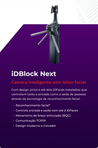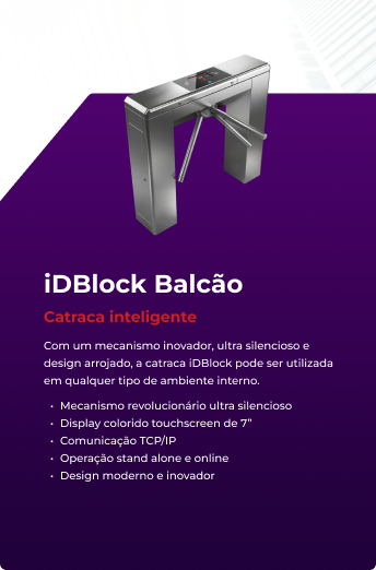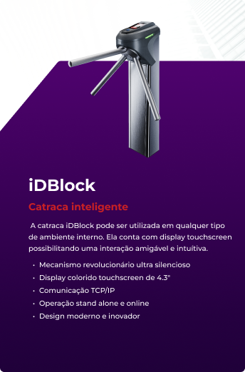 A catraca iDBlock pode ser utilizada em qualquer tipo de ambiente interno. Ela conta com display touchscreen possibilitando uma interação amigável e intuítiva.