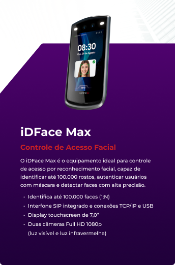 O iDFace Max é o equipamento ideal para controle de acesso por reconhecimento facial, capaz de identificar até 100.000 rostos, autenticar usuários com máscara e detectar faces com alta precisão.