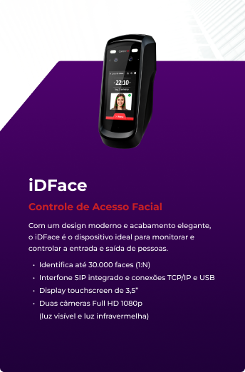 Com um design moderno e acabamento elegante, o iDFace é o dispositivo ideal para monitorar e controlar a entrada e saída de pessoas.