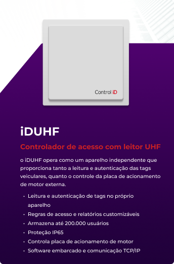 o iDUHF opera como um aparelho independente que proporciona tanto a leitura e autenticação das tags veiculares, quanto o controle da placa de acionamento de motor externa.